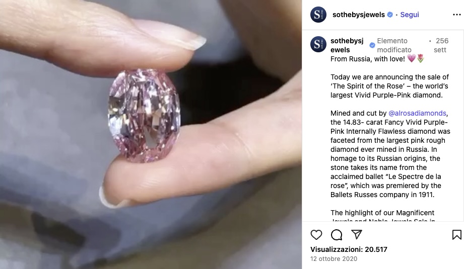 14,83 carati di pura meraviglia e una forma ovale scelta dai tagliatori russi per riflettere le infinite sfumature del suo rosa vivido. La gemma, ritenuto il più grande diamante rosa estratto finora in Russia, sarà battuta all’asta da Sotheby’s l’11 novembre. E il prezzo di partenza è da capogiro: circa 20 milioni di euro.