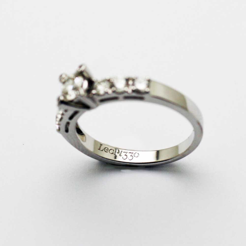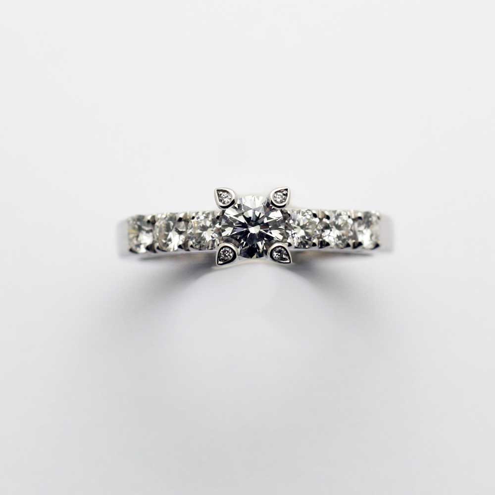 Anello in oro bianco 18 Kt con diamante centrale da 0,30 ct, incassato con delle griffe con brillantini, e contornato da tre diamanti per parte, firmato Leo Pizzo.