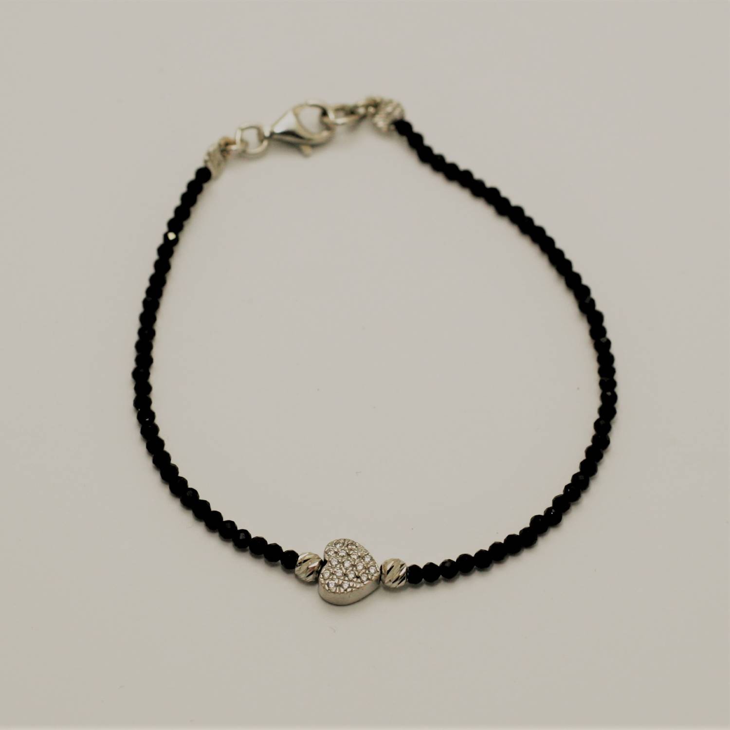 Bracciale di nostra produzione con onice sfaccettato con centrale a forma di croce in argento impreziosito da zirconi incassati e due piccole sfere lavorate in argento 925. Abbiamo inserito un centrale con zirconi incastonati perché dona luce e contrasta il nero della pietra. Montato su cavetto in acciaio con chiusura in argento 925. L’onice è una pietra con numerose proprietà positive per il nostro benessere