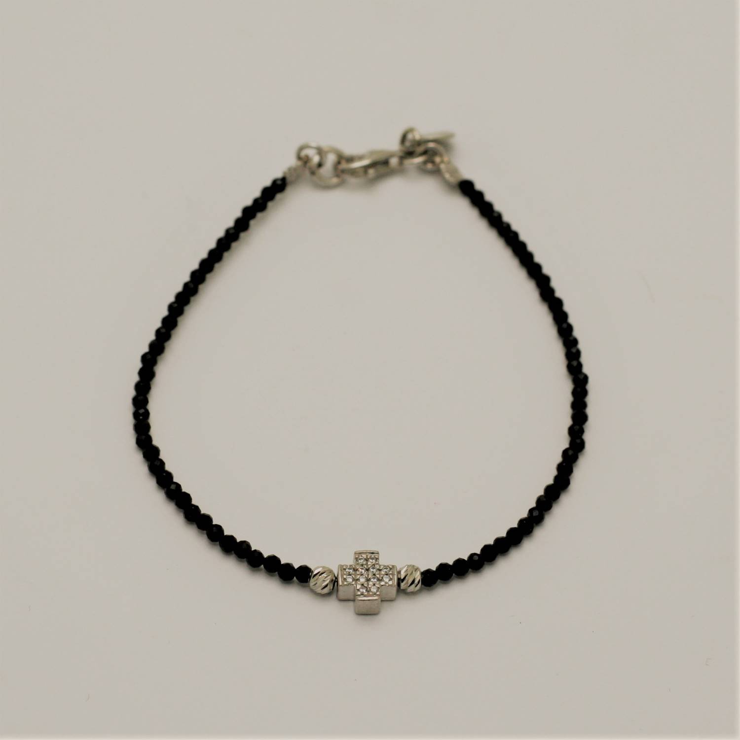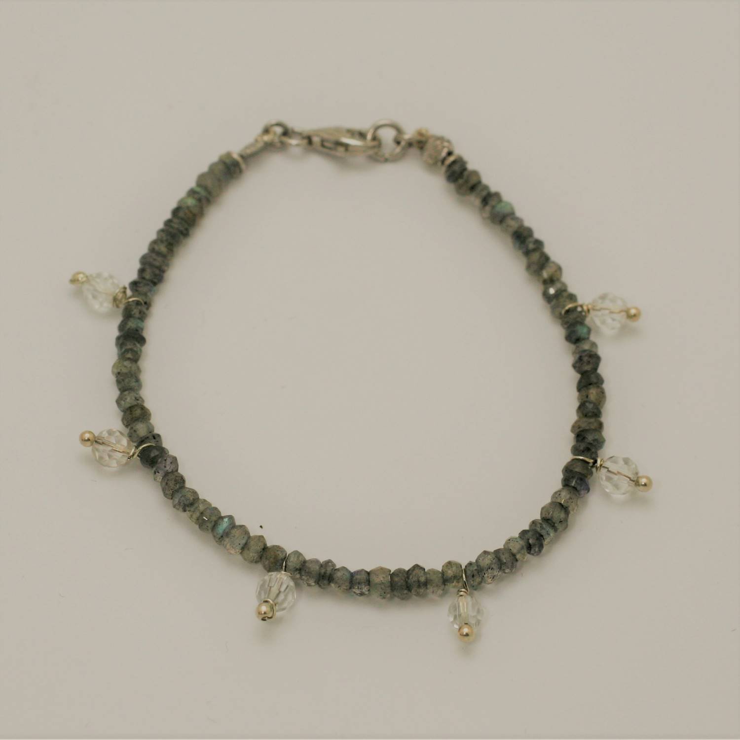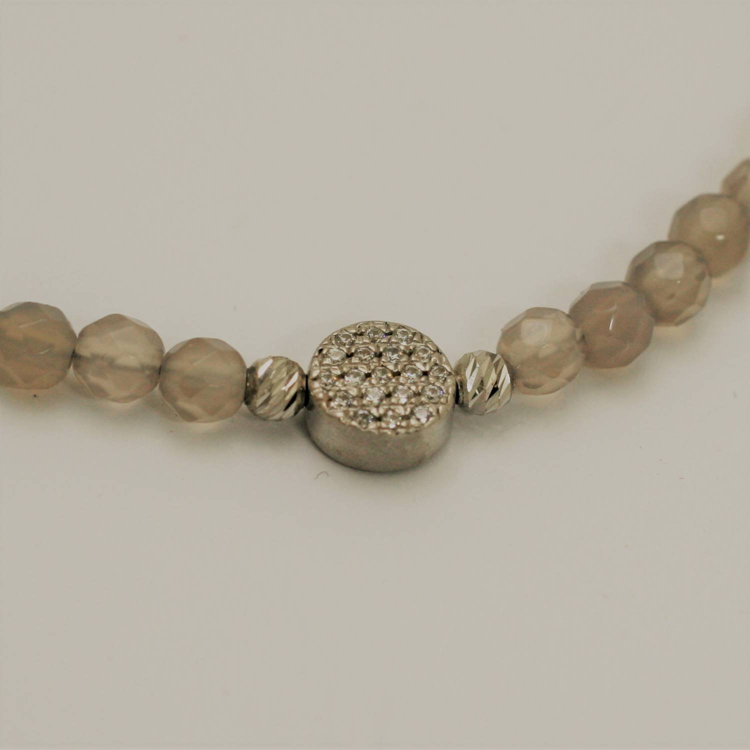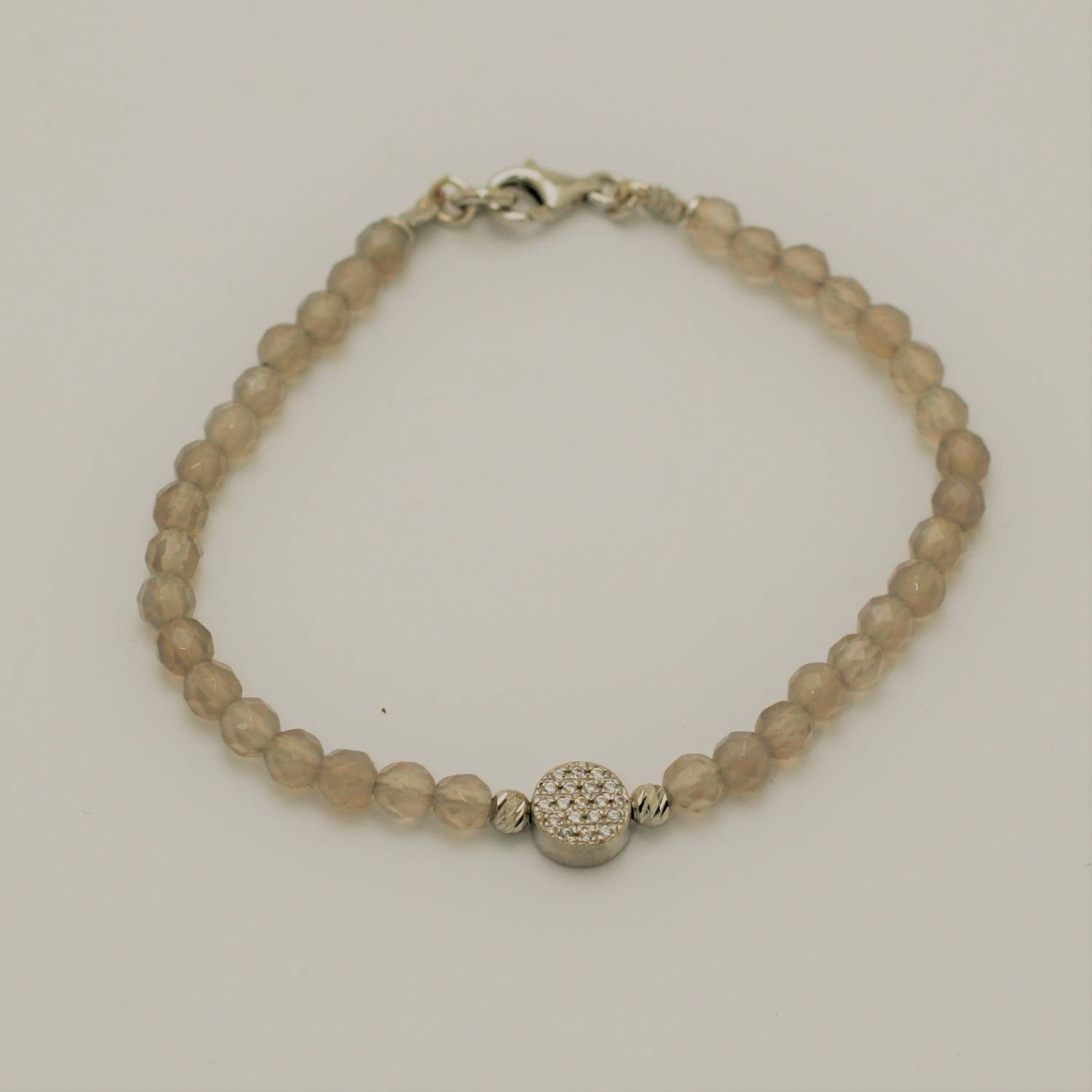 Bracciale di nostra produzione con labradorite e un centrale a forma di tondo in argento impreziosito da zirconi incassati e a lati due piccole sfere lavorate in argento 925, montato su cavetto in acciaio con chiusura in argento 925. I toni tenui e delicati lo rendono perfetto per essere indossato da solo o insieme ad altri bracciali inoltre il centrale rotondo simboleggia la perfezione della figura geometrica del cerchio. La labradorite è una pietra con numerose proprietà positive per il nostro benessere