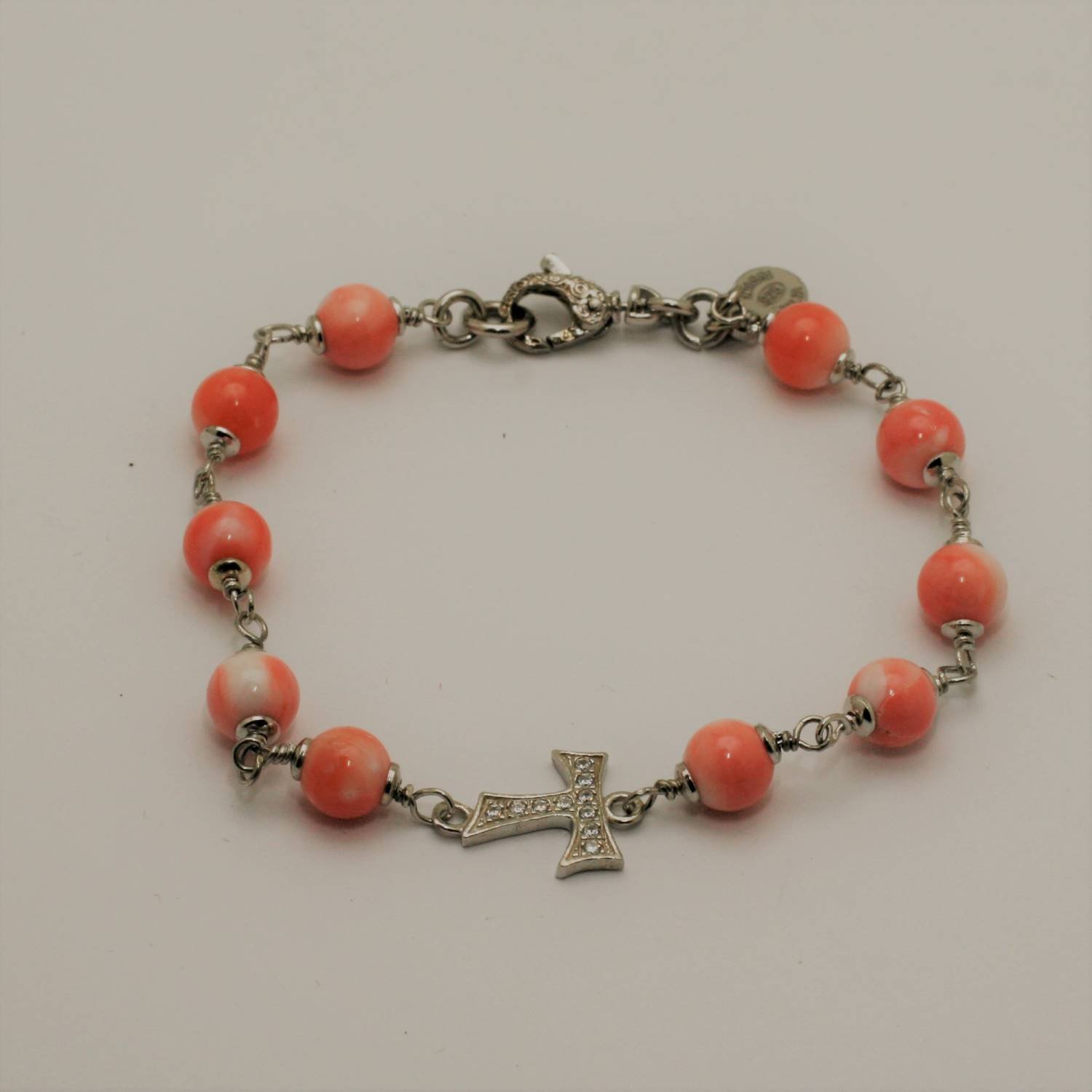 Bracciale in Argento con corallo rosa e tau con zirconi