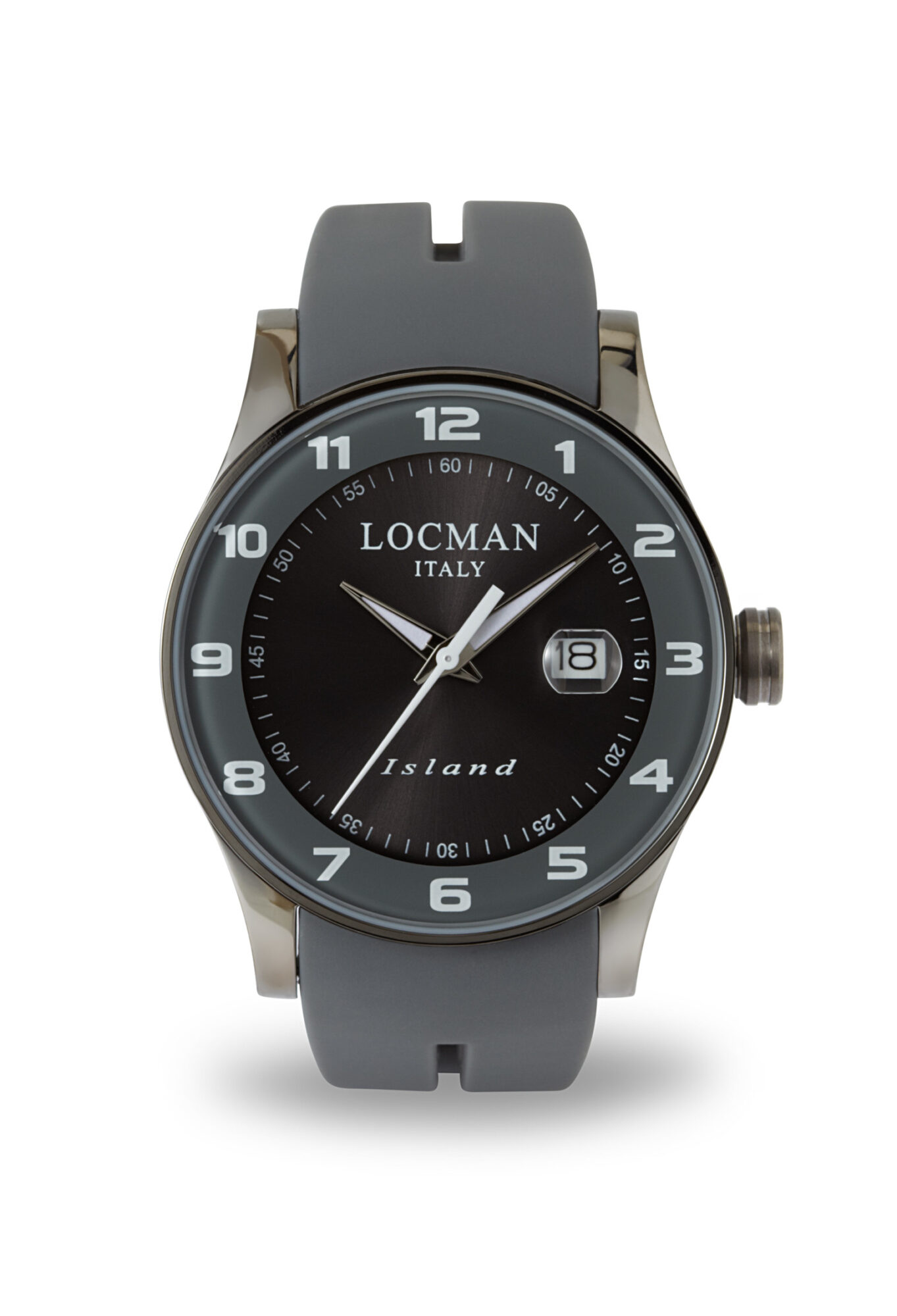 Il quadrante grigio è protetto da vetro minerale con trattamento zaffiro, datario ore 3 con lunetta, un movimento al quarzo preciso e affidabile. Il cinturino, disponibile in silicone anallergico resistente, garantisce massimo comfort al polso e un’estetica sportiva ma elegante. Il fondo in titanio riporta il segno che rende Island ancora più speciale, l’incisione ad acido raffigurante l’Isola d’Elba.
