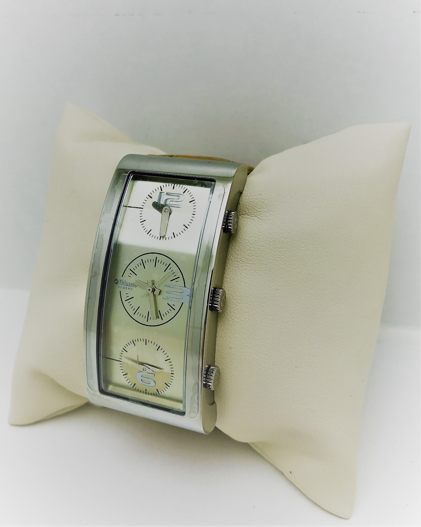 Quadrante con tre lunette che indicano orari differenti, cinturino in pelle beige. La cassa rettangolare con linee ergonomiche avvolge il polso con eleganza contemporanea. Il quadrante minimalista enfatizza la chiarezza visuale, mentre il cinturino in pelle rende l’orologio perfetto per chi ama accessori dal look raffinato e discreto. Perfetto per chi viaggia molto, in un unico quadrante tre fusi orari diversi.