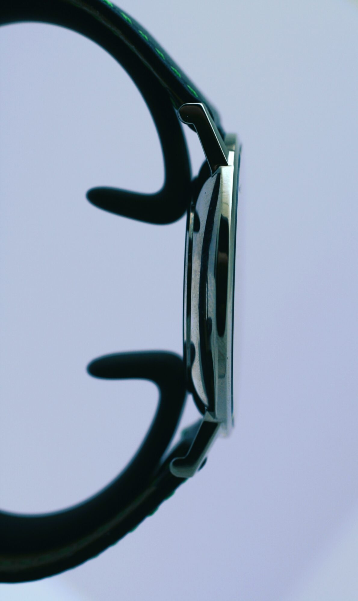 - Cinturino fatto a mano in pelle nera con impunture sui lati verdi uguali alle lancette