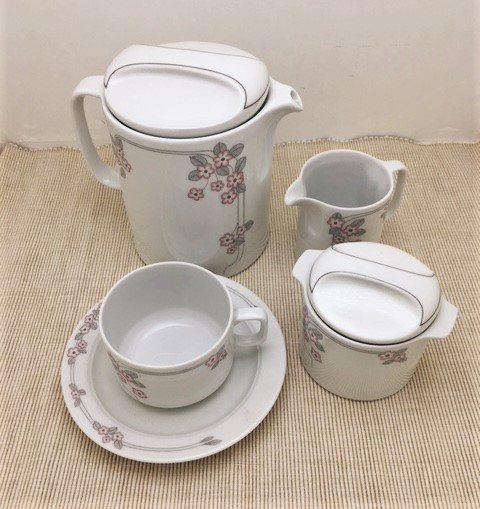 Servizio tè 9 pezzi realizzato in porcellana bianca lucida con un decoro lineare sui toni del grigio e dei fiorellini rosa stilizzati. Servizio dalle forme pulite e moderne con un tocco romantico dato dal motivo floreale. Servizio vintage per chi ama il favoloso mondo degli oggetti d’epoca, in una eccellente porcellana bianca con un decoro delicato. Rendi speciale il tuo momento di relax con queste tazzine deliziose. Set completo.
