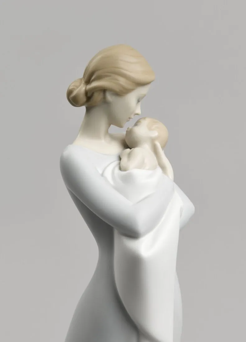 Figura che rappresenta una madre in porcellana opaca con il suo bambino in braccio avvolto in una coperta bianca. Lo sguardo della madre è amorevole e pieno di tenerezza. . Una giovane madre abbraccia la sua bambina avvolta in una coperta. La figura della madre è idealizzata, con tratti sintetici: con i capelli tirati indietro e un abito dritto verde chiaro. Ma allo stesso tempo trasmette la tenerezza della scena attraverso l’anatomia dell’abbraccio, con uno sguardo inclinato sul bambino e un atteggiamento avvolgente. È un pezzo di stile innovativo, per le sue linee pure e la sua modellazione sintetica. È stata utilizzata la finitura opaca, con la quale si ottiene un tocco morbido, invitante a prendere il pezzo tra le mani come un abbraccio. Regalo perfetto per una nascita o per la festa della mamma