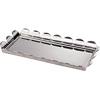 Il Vassoio recinto di forma rettangolare è realizzato in acciaio inossidabile 18/10, lucido, con bordo rialzato decorato con smerlatura e manici con taglio eseguito al laser. Il bordo smerlato caratterizza un progetto mendiniano dell’epoca di Alchimia, nei primi anni ’80, e allora prodotto artigianalmente in poche decine di esemplari; dal 1997 è entrato nella produzione Alessi, declinato in vassoi e cestini, con una felice sintesi di forma e funzione. Vassoio dalle giuste dimensioni per portare due tazzine di caffè, per servire dei pasticcini o dei grissini. Facilmente lavabile e riponibile all’interno dei propri spazi.