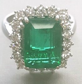 Fig. 1 – Anello sottoposto ad analisi, con pietra verde taglio a gradini forma ottagonale dal peso stimato di circa 6.50 ct, contornata da 18 diamanti naturali dal peso di circa 0.13 ct cadauno.