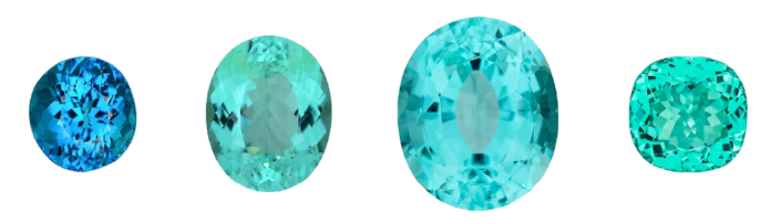 Paraiba: questa varietà molto rara, associabile genericamente all’Indicolite assume un colore molto particolare, un azzurro-verde brillante dovuto alla presenza nel suo reticolo cristallino di rame.